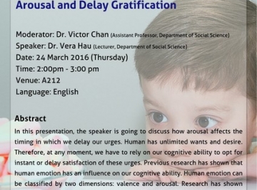 24 March 2016 The 4th Colloquim (2015/16) Topic: Arousal and Delay Gratification Speaker: Dr HAU Chui Luen, Vera,Lecturer, Department of Social Science Date: 24 March…