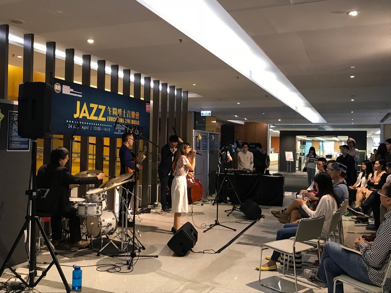 Jazz Roaster (comprising Barry Lam [double bass player], Mark Leung [guitarist] and Felix Leung [drummer]) featuring Maggie Wong (vocalist) brought all-time favourites Take the A Train, Misty, My One and Only Love, Anthropology, Quiet Nights of Quiet Stars, and One Note Samba, etc. to two groovy afternoons before the exam period. The musicians injected a new spark of life into the timeless pieces with their improvisations. The audience enjoyed the music as well as Barry’s amusing brief of the style and story of each song.