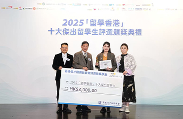 2026年1月15日 傳播學院學生江雅晴於青年港漂總會2025年「留學香港」獲選為十大傑出留學生。江雅晴學業成績優異,積極參與義工活動,並在多項比賽和實習中表現出色。她榮獲第十屆中國數據新聞大賽港澳台賽區三等獎,並於廈門日報及廈門海滄區融合媒體中心實習,負責營運媒體帳號、制定內容策略及製作短片等,充分實踐課堂所學。 江雅晴(右二)獲選「留學香港」十大傑出留學生。