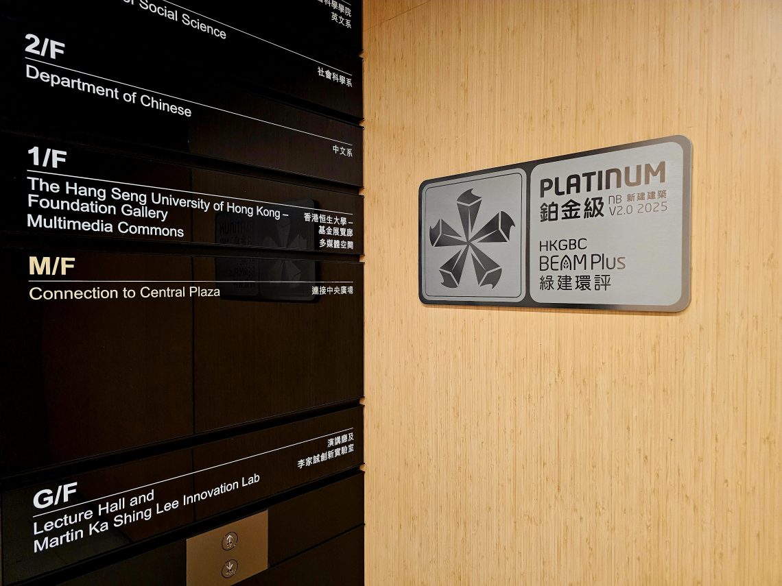 創意人文館獲「綠建環評」新建建築2.0版最終鉑金級認證 News,副校長(機構發展)辦公室 | Friday, der 30. January 2026 2026年1月30日 恒生大學創意人文館獲香港綠色建築議會頒發「綠建環評」新建建築(2.0版)「最終鉑金級」認證,這是表彰可持續建築的最高級別,突顯大學在環保建築方面的卓越表現。鉑金認證牌匾於2026年1月下旬已在校園展示。創意人文館於2024年3月正式啟用,設計融合先進節能系統、環保建材及建築信息模擬技術,並配備太陽能板等設施,充分體現綠色建築理念。建築期間,團隊嚴格執行各項環保措施,減低對周邊環境及自然生態的影響,最終在綠建環評新建建築2.0版評審中取得優異成績,成功獲評最高鉑金級別。 鉑金認證牌匾於創意人文館M層升降機大堂展示。 創意人文館 恒生大學就業博覽吸引逾120間企業及政府部門參與 提供超過1500個就業機會