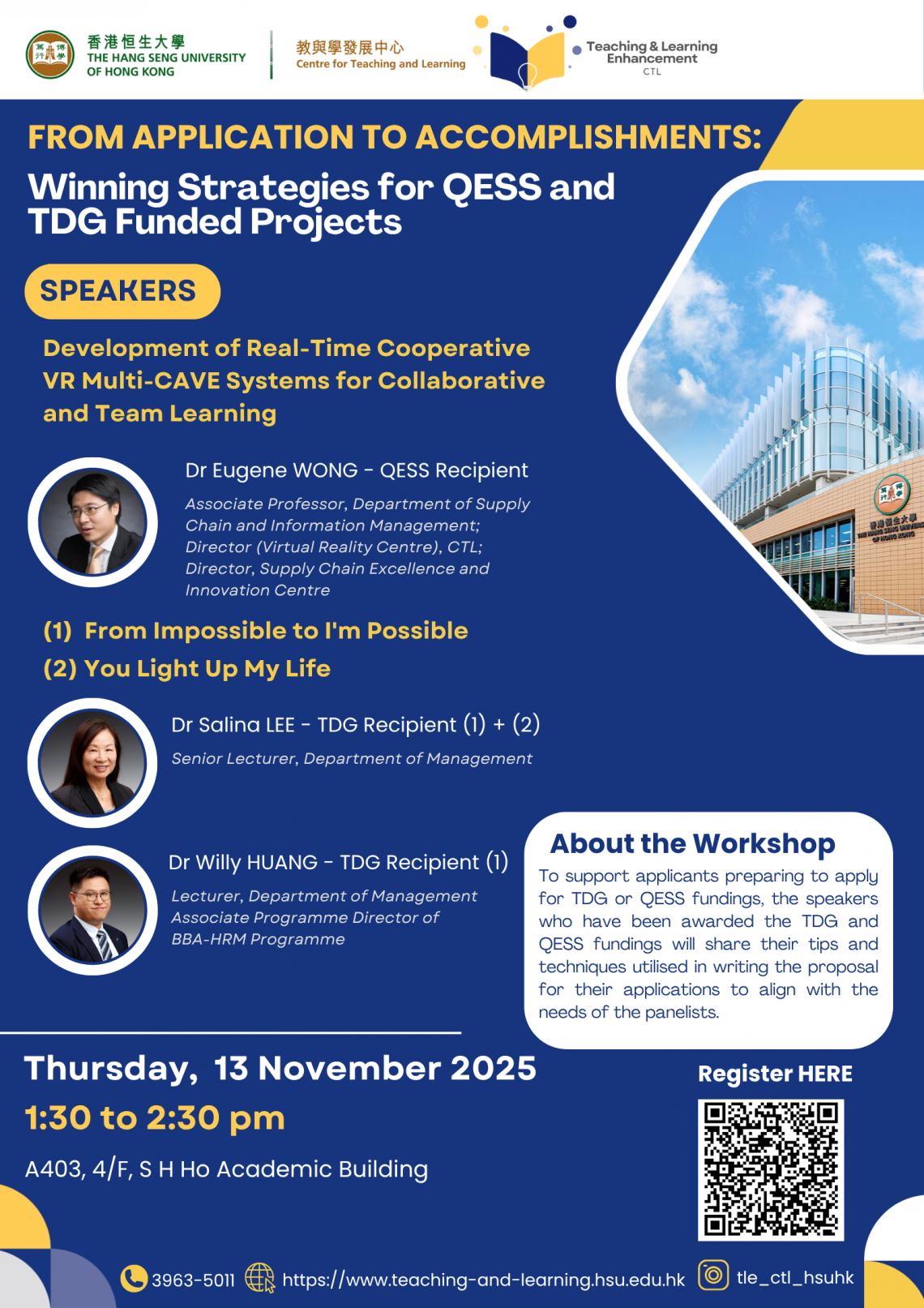 The Centre for Teaching and Learning (CTL) and the Teaching and Learning Enhancement Section, CTL, cordially invites you to join a sharing on TDG and QESS project. Are you trying to apply for external and internal fundings? Let us hear from our QESS and TDG recipients to find out what their project is about and receive some tips and techniques on securing a QESS and TDG project.