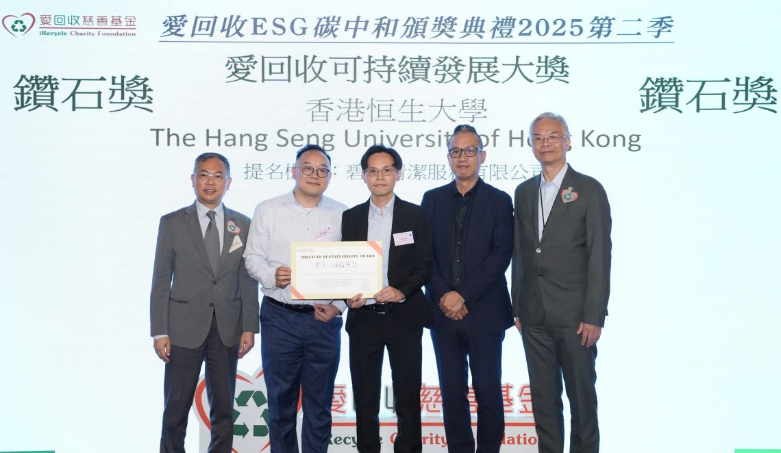 HSUHK won two prestigious awards, presented on 24 October 2025: the Energy Management Award under CLP Power Hong Kong Limited’s “Smart Energy Award 2025”, and the Diamond Award from iRecycle Charity Foundation’s “iRecycle Sustainability Award”.